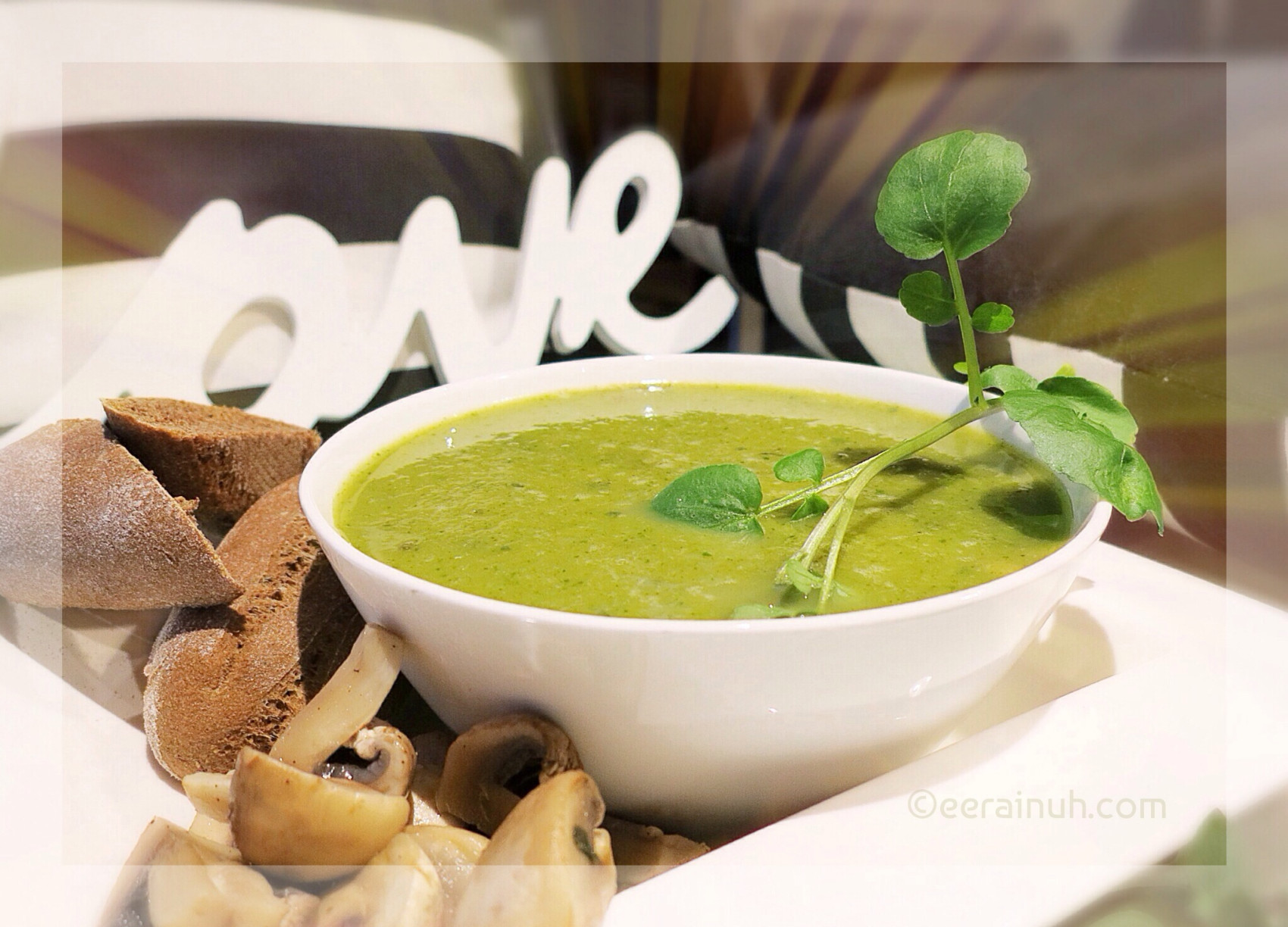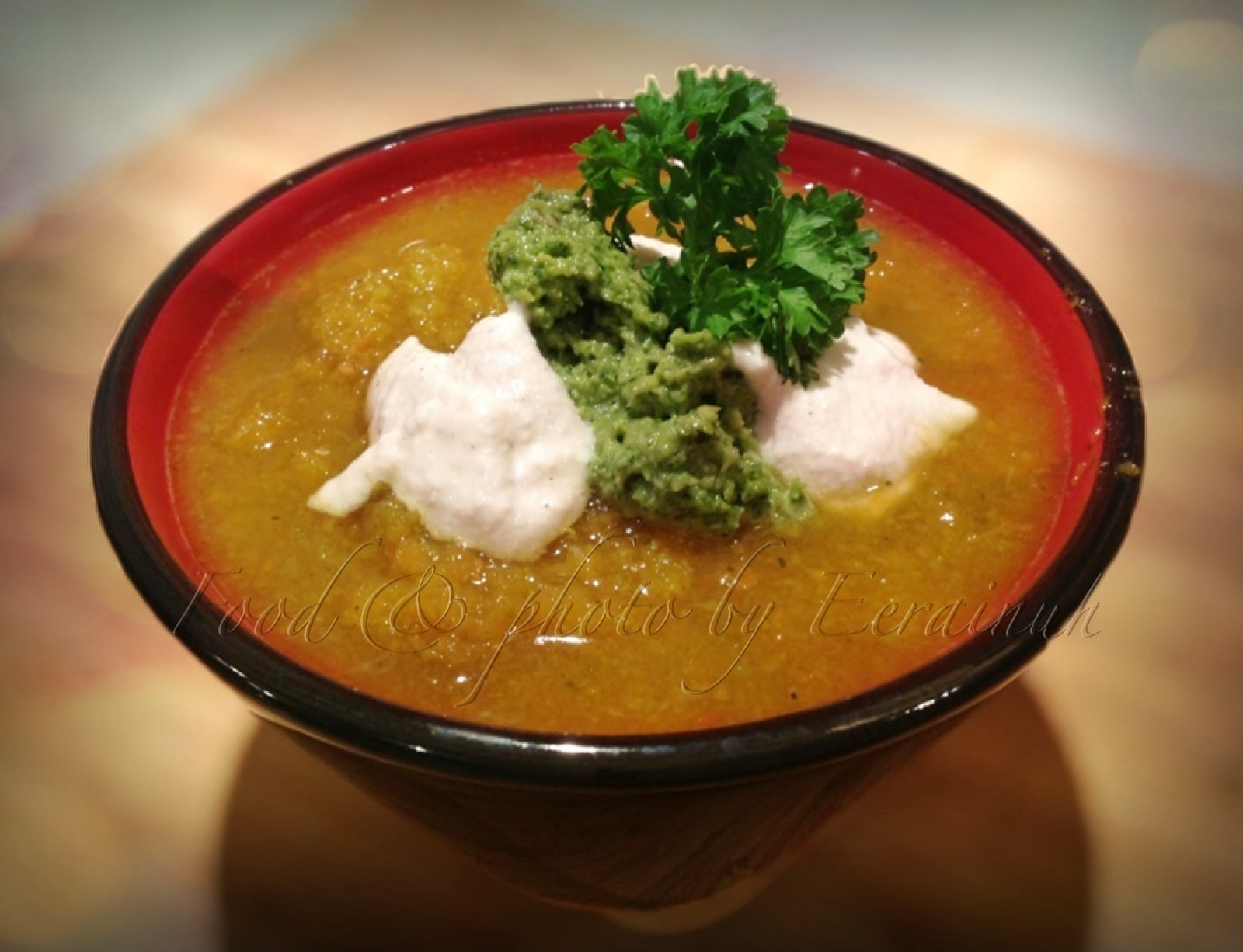 - 5 Veggie Soup w Coriander Pesto & Garlic Cream