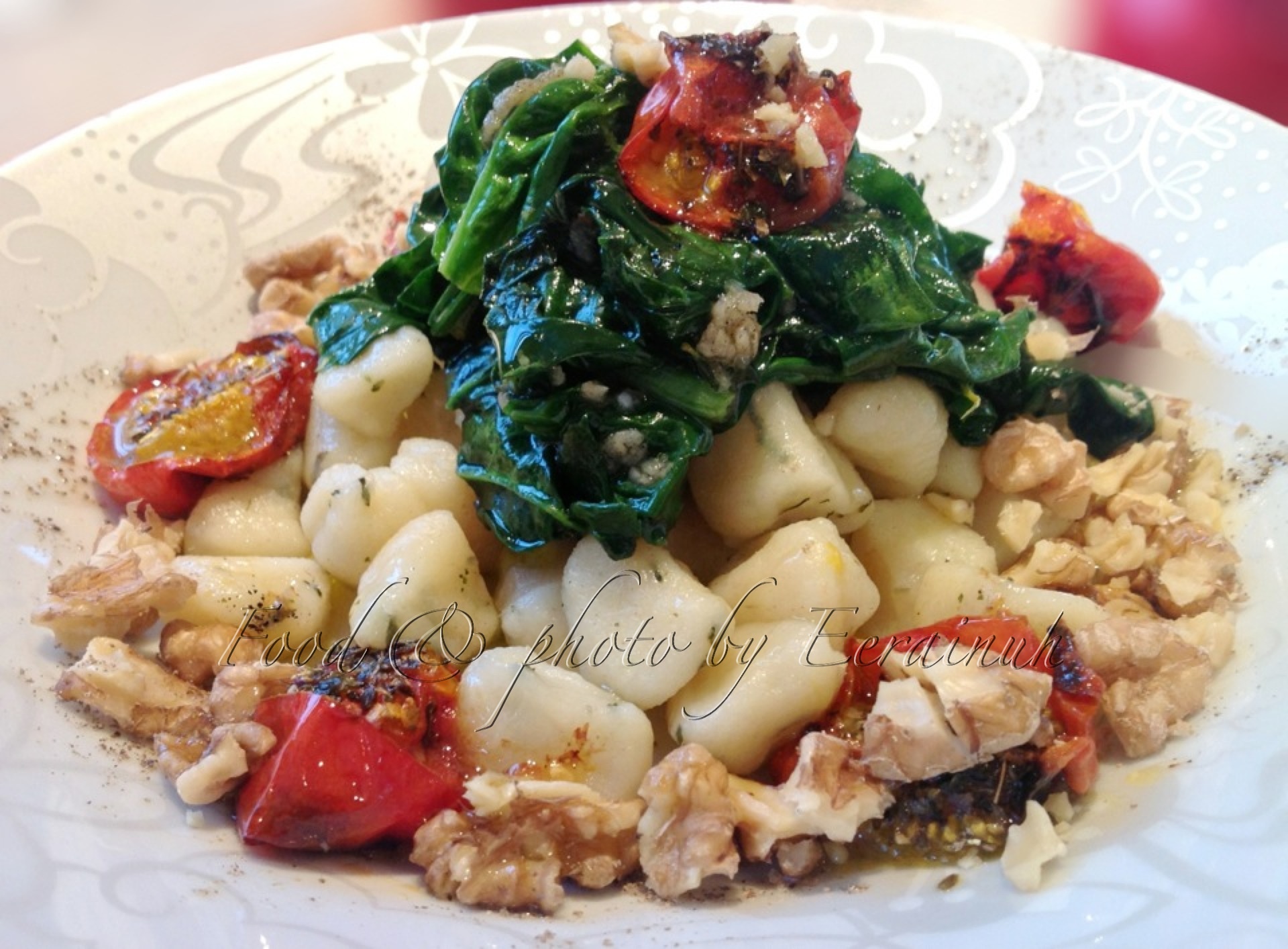 - Garlic & Tarragon Gnocchi w Roasted Tomatoes, Wilted Spinach & Walnuts